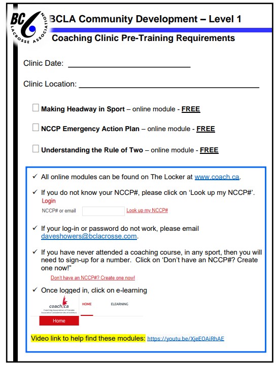 Coaches Canada now requires all coaches (Level 1 certification) to complete three online modules (Coaching clinic online modules PDF - shown on the image below) before attending the coaches clinic.